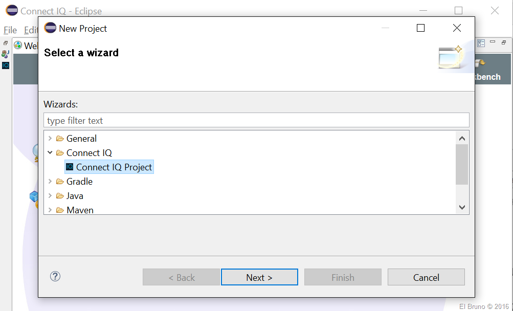 Now we can now create our first project for a Garmin app. Let’s start with “File / / New Project” and then select “Connect IQ / / Connect IQ Project”