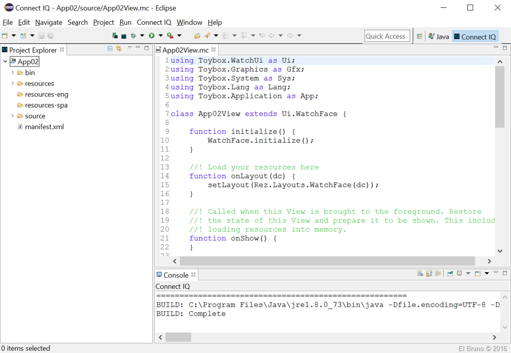 There is a couple more extra options to choose, like the WatchFace type and the supported languages. And now we have a minimmun set of code to be build and run Eclipse for Garmin Connect IQ App