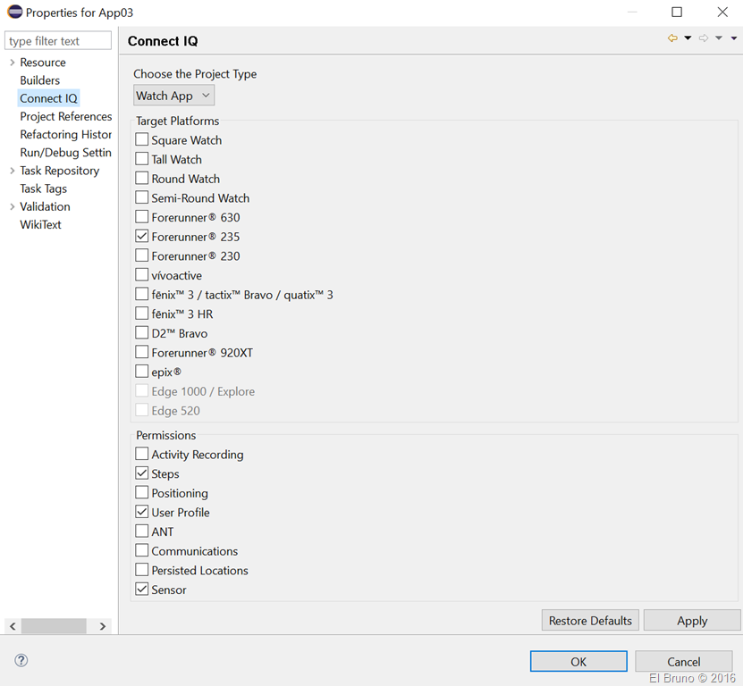 So, once we created an app in Eclipse, next step is to configure some project properties. I selected the app type as “Watch App” so I can access to the sensors information. Other project types does not allow access to sensors information.