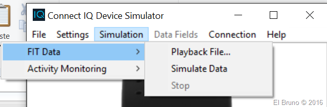 So, right now we have the basic code to create and app and display HR sensor data. If we run the app in the simulator, we’ll realize that the sensors data is NULL. We can emulate the data from the emulator with the options “Simulation // FIT Data // Simulate Data”