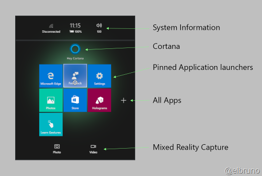 También podemos encontrar información sobre el punto de entrada a nuestro device: Hologram Shell. Yo estaba bastante interesado en cómo han solucionado esto, veo que se respeta el concepto de Menu de Windows 10 y claro, Cortana es parte esencial delas Hololens.