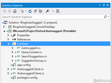 Hasta el día de hoy no hay SDK oficial para trabajar con este servicio, así que crearé uno en pocos pasos. En mi repositorio de GitHub, es posible encontrar una solución con 2 proyectos que incluyen una app de Consola para las pruebas, y una Client library para trabajar con la API de Bing Autosuggest.