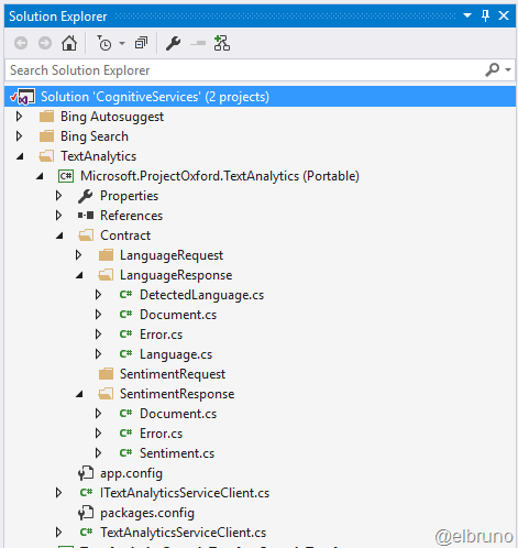 Sobre esta base he escrito un ejemplo donde hay una Client Library para interactuar con la API, inicialmente solo he implementado las funciones de análisis de idioma y de sentimiento. Esta API require el envío utilizando un body más complejo, así que he implementado el uso de una acción HTTP POST para esto. Y también es por esto que he creado contratos para las acciones de Request and Response para cada una de las APIs.