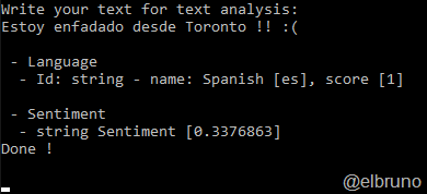 Y el ejemplo final es con una Console App que pide un texto de entrada y realiza el análisis sobre el mismo. Un ejemplo con un texto en inglés con un mensaje positivo retornaría el siguiente resultado
