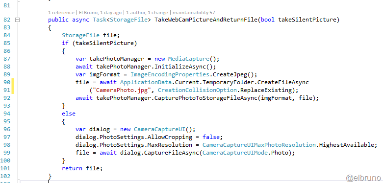 Para sacar una foto, he reutilizado una función que saca una foto, guarda la misma en un storage local y retorna el archivo creado. Además soporta sacar fotos en “modo silencioso”, en donde el usuario no se entera de que está sacando fotos; y en “modo normal” en el que aparece la ventana del SO para sacar fotos.