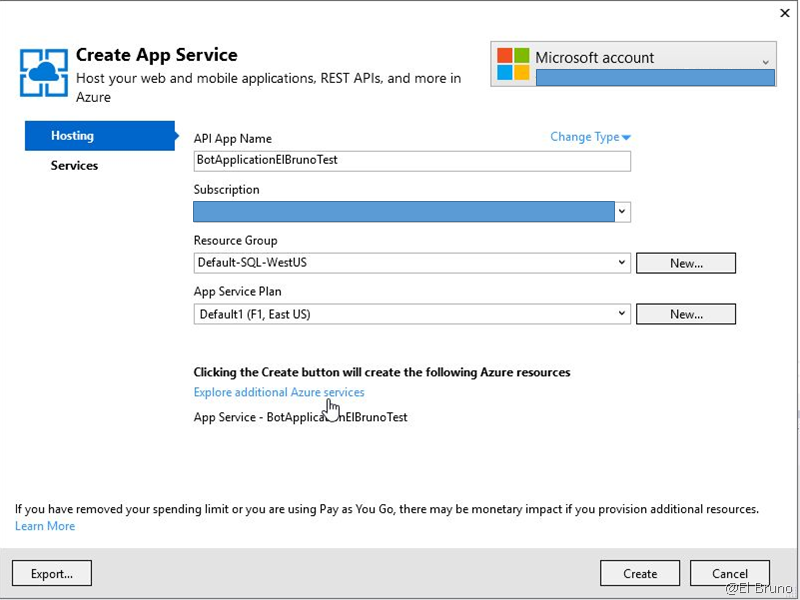Esto lanza el asistente de publicación de Azure. Para este caso crearemos una App Service, que llamaré “BotApplicationElBrunoTest”