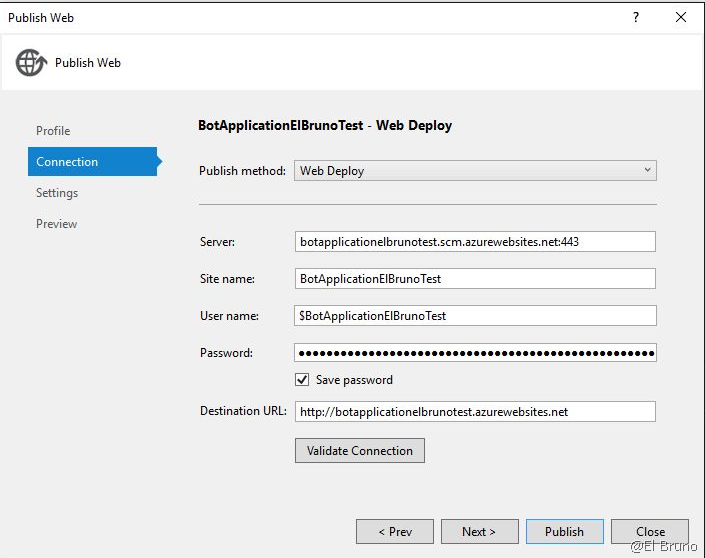 Detalle importante, es anotar la url de publicación [http://botapplicationelbrunotest.azurewebsites.net/]