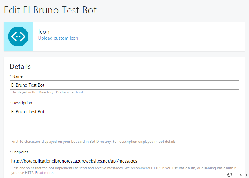 Lo primero que debemos hacer es navegar a la sección “My Bots” para registrar el bot. En el proceso de registro la mayoría de los campos son bastantes descriptivos, y lo único a tener en cuenta es el endpoint de nuestro bot. Para esto usamos la url de publicación en Azure con el sufijo /api/messages.