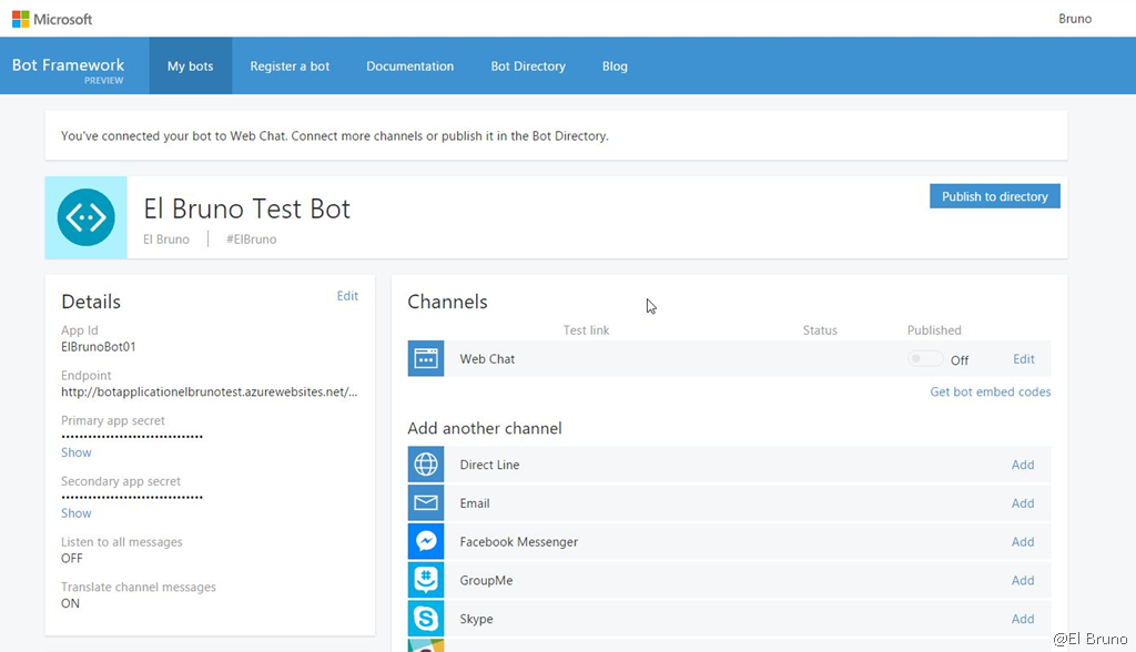 Y listo ! Nuestro Bot ya está registrado en el directorio de Bot Framework. Por defecto, los bot habilitan un canal de Web Chat para poder interactuar con los mismos.