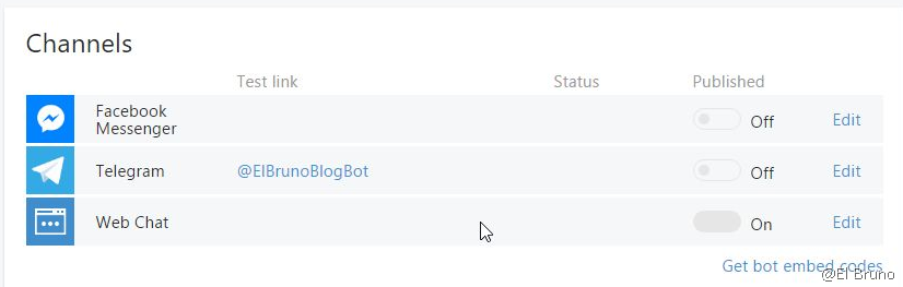 Como escribí en post anteriores, una vez que se publica el bot, el canal Web Chat se activa por defecto y es el primero que podemos utilizar.![]()