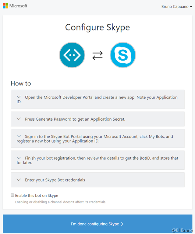 Llegado a este punto, lo siguiente y natural para mi fue intentar integrar el canal de Skype con mi Bot. Para acceder a la configuración del mismo tenemos que navegar a Skype Bot Configuration page. Y como se ve en la siguiente imagen, los pasos a seguir son bastantes sencillos.