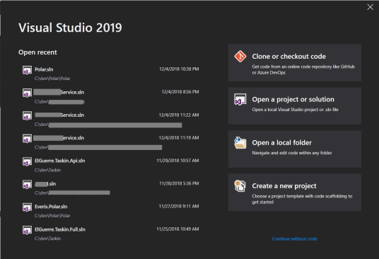 - Nueva ventana de inicio con acceso rápido a proyectos recientes, nuevos proyectos, clonado de repositorios Git y apertura de carpetas.