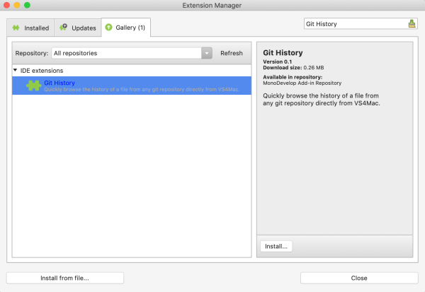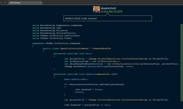A la hora de trabajar con un proyecto en Git, Visual Studio para macOS cuenta con soporte integrado. Sin embargo, recientemente probé git-history. Sin duda, una forma intuitiva y muy interesante para ver le historial de cambios en un archivo. Así que, ¿por qué no tenerlo integrado en Visual Studio para macOS?.