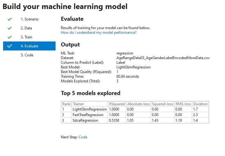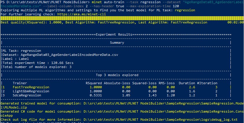 mlnet auto-train --task regression --dataset "AgeRangeData03_AgeGenderLabelEncodedMoreData.csv" --label-column-index 2 --has-header true --max-exploration-time 60