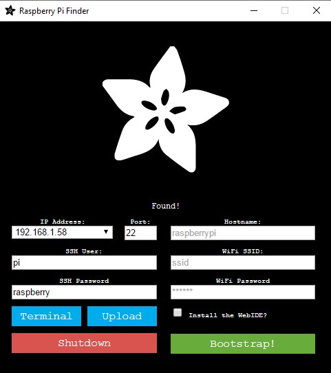 Finally, if your device is connected to the same wireless network but you don’t know the IP address, you may want to use a tool like Adafruit Raspberry Pi Finder. It only requires 2 clicks to find one or more devices in your network.