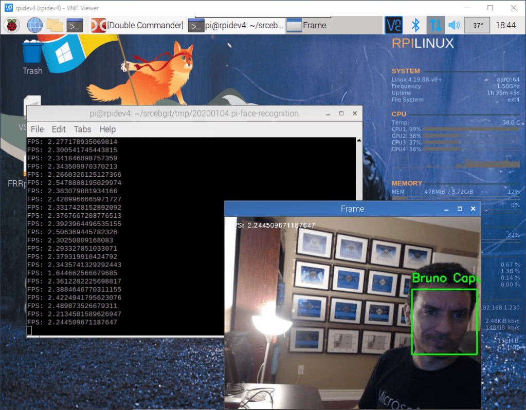 Face Recognition app in a Raspberry Pi with ICE Tower Cooler fan, runs at 38C degrees