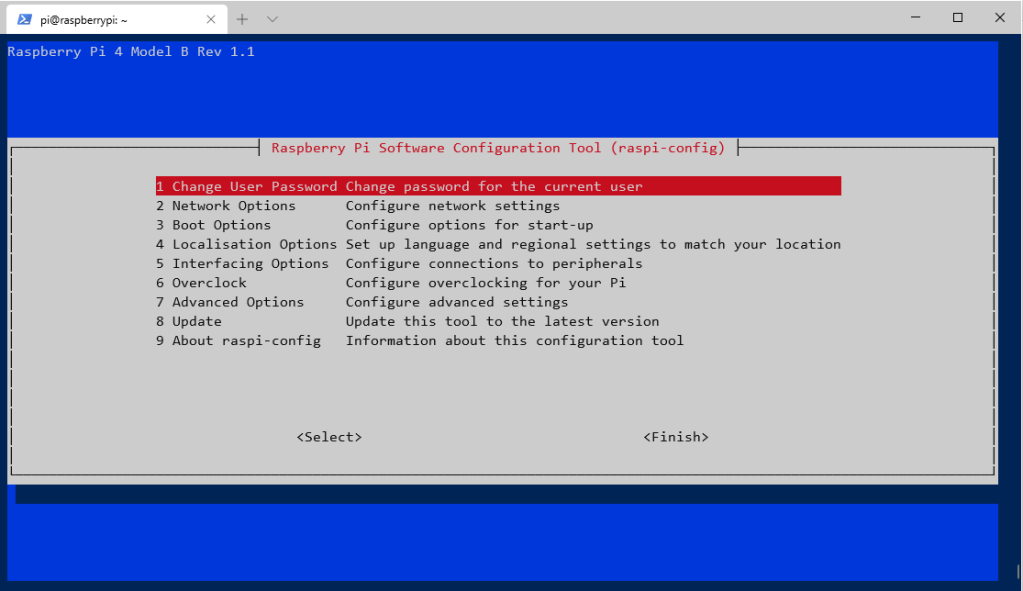 The default password for the device is “raspberry”, and as usual, it’s recommended to change it. In order to do this, in the ssh terminal, let’s access to the device configuration