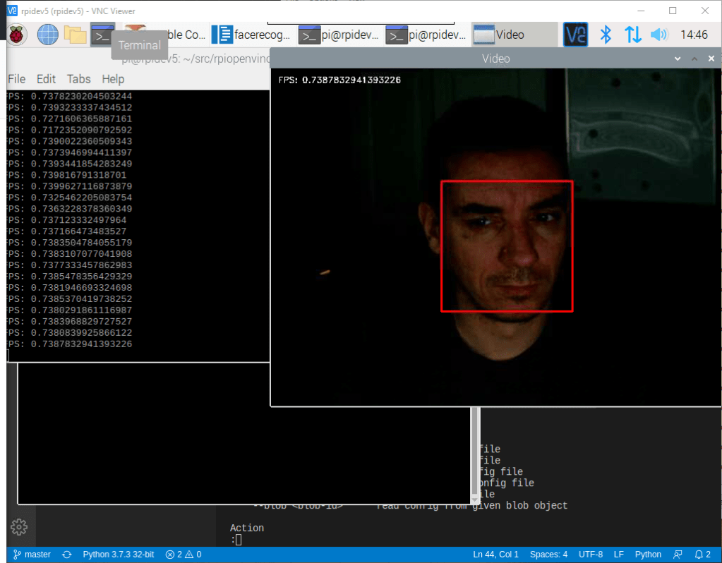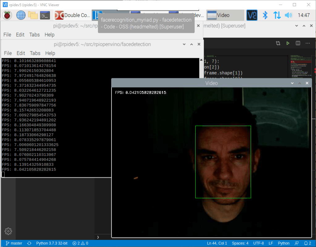 So, I decided to create a new python sample to run live face detection using the camera feed and also display the FPS. This is the output code:
