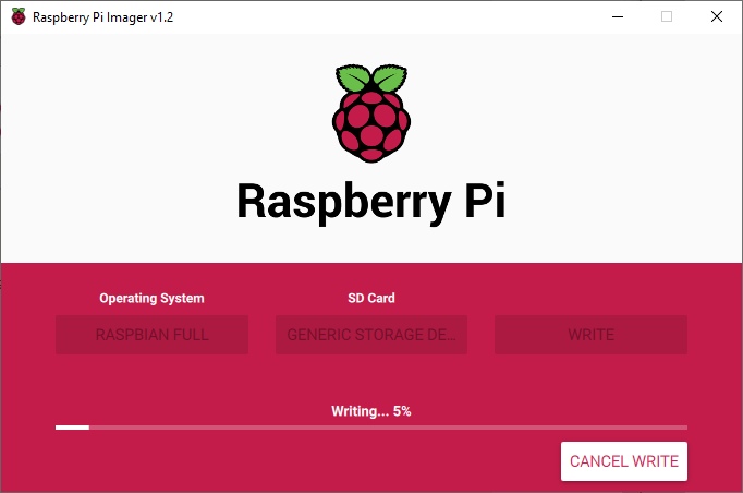 Important: depending the selected image, writing process may take some time. The Full Raspbian version is +2.5GB and it needs to be downloaded in chunks. before starting the write process.