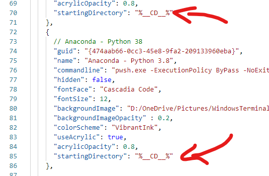 Fabian explains the full scenario (see references), however the magic is to add the “startingDirectory = %__CD__%” in the profile definition in Windows Terminal Settings. In example, line 14: