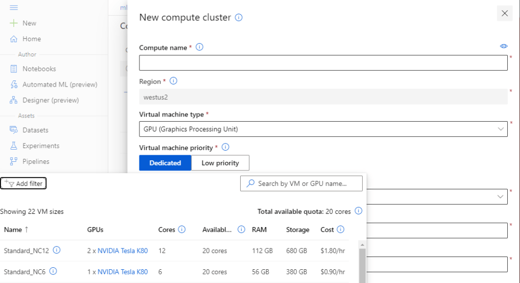 Here is also important to remark, that you need to create a Dedicated GPU based Compute Cluster. There are some expenses / costs associated to these resources, so make your numbers before you start.