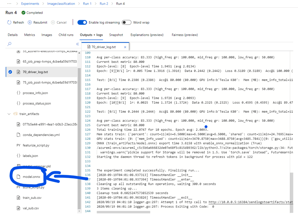 The Script experiment is the one we can open to get access to some detailed logs, and also to the ONNX model.