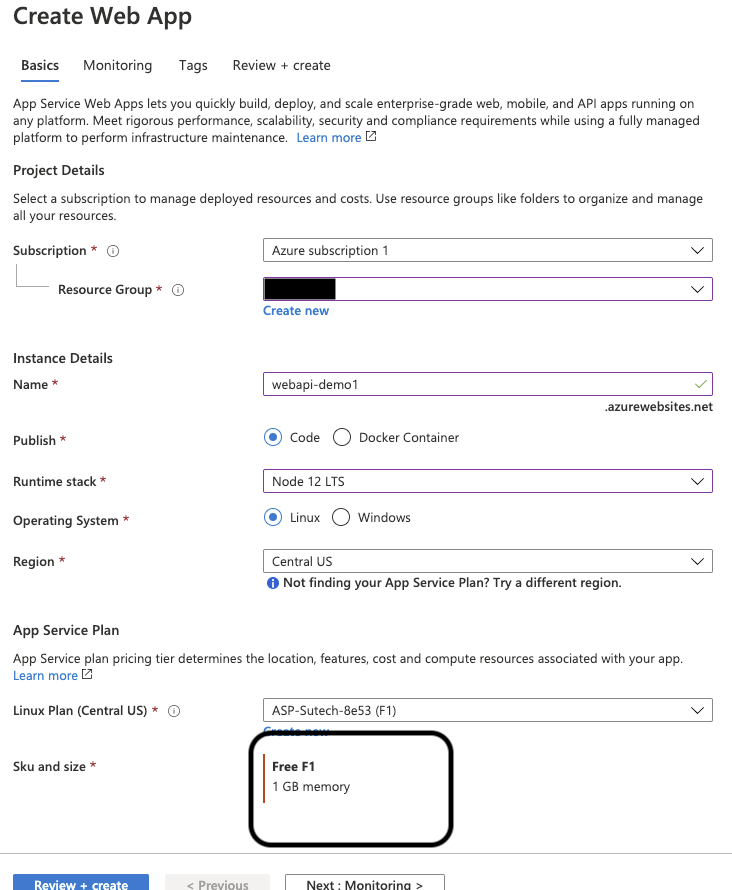 El primer paso seria crear nuestro App service que nos ayudará a alojar nuestra app. En este caso vamos a crear un App service gratuito para una maquina linux. En el ejemplo estoy usando una Api en Node.js.