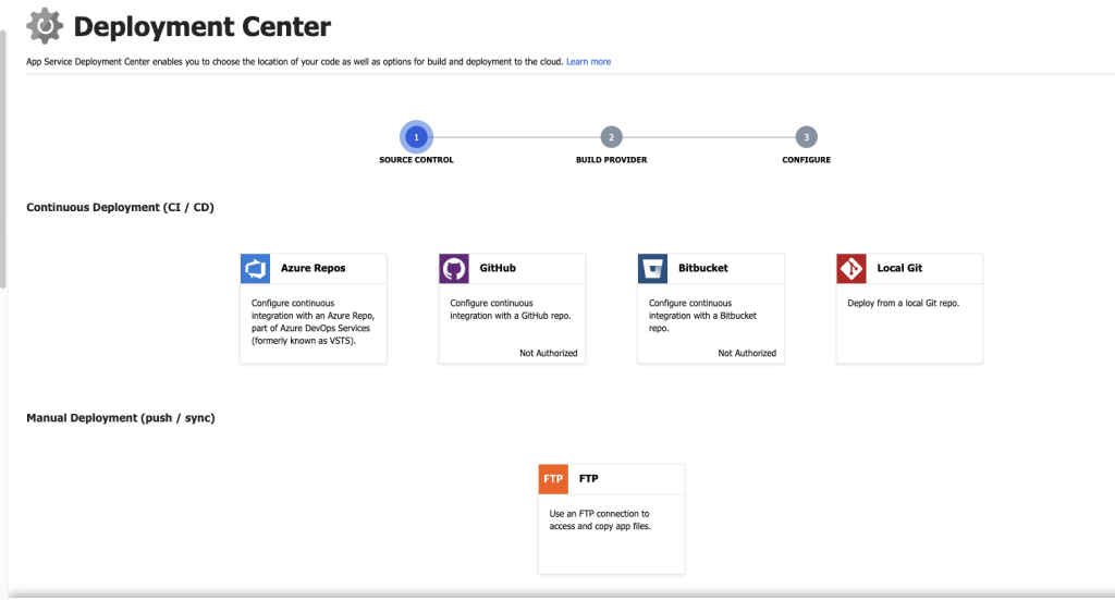 Azure Deployment center es una funcionalidad que tienen varios servicios de Azure en donde fácilmente podemos seleccionar la fuente donde se encuentra nuestra nuestro código en algunos simples pasos y de esta forma podemos tener toda la configuración de integración continua y despliegue continuo de nuestra app hacia Azure.