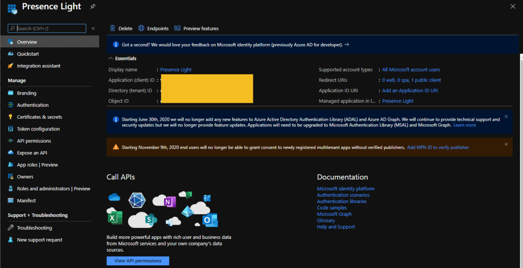 Again, I need to learn more about this. The latest version of Presence Light does not longer requires Admin Consent, so this is no longer an issue for folks that want to get Presence. It didn’t work for me so, I created the app, and is up and running !