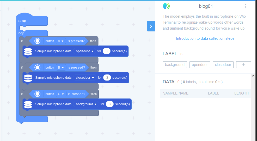 - When we press the [Button A] it will record a [3 seconds] audio for the [open door] label.