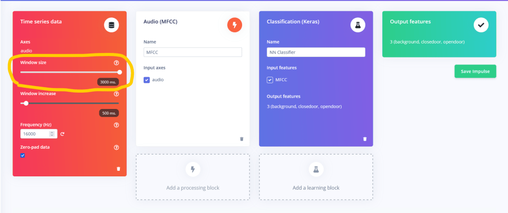 On the Edge Impulse definition, I change the window size to 3 seconds. Note: More details on this later.