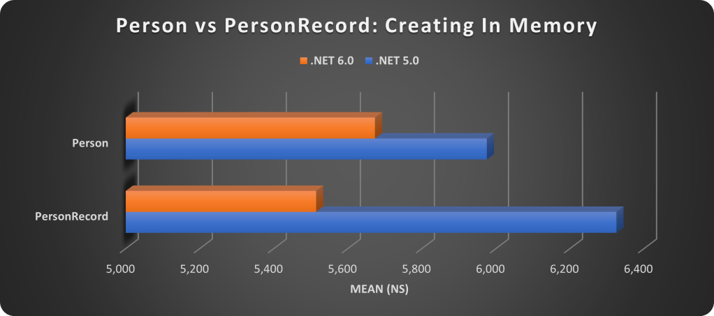 First, let us look at the performance difference creating a normal Person object compared to a PersonRecord object. Depending on if you are using .NET 5 or 6, overall, Person is more performant. But, in .NET 6, the speed is much better.