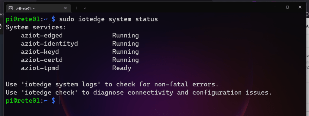 From here and on, you can check the official documentation on how to add your device connection string to register the device. Once the device is registered the following command will help us to check the service