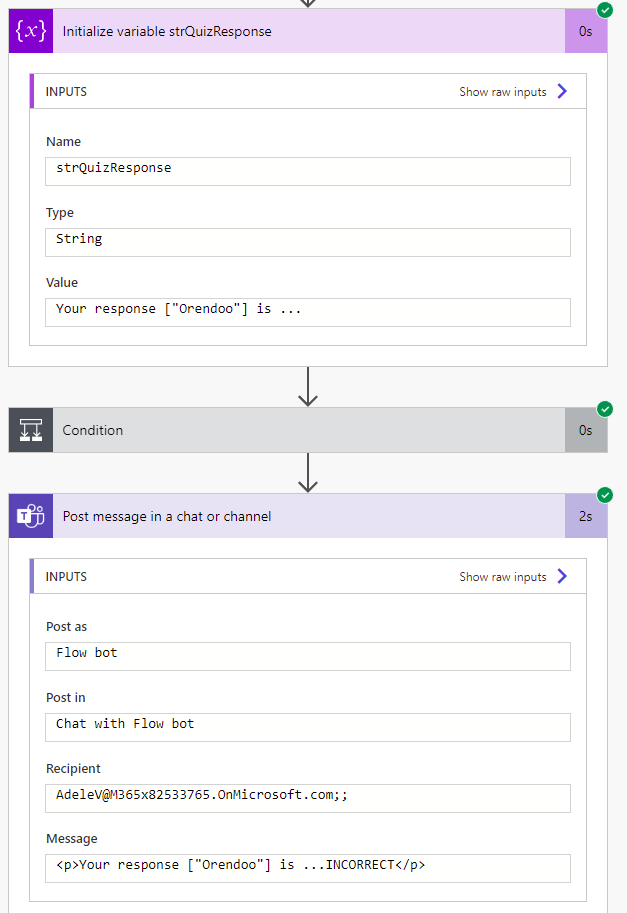 Once the flow is running, we can see in the history how the variables, conditions and responses are processed.
