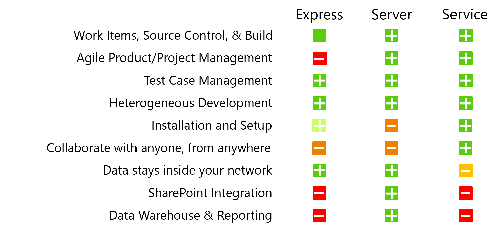 Team Foundation Service es un servicio de TFS on the Cloud. El siguiente gráfico nos muestra las principales diferencias que hay entre la versión Express, la versión on Premise y la versión on the Cloud (Service).